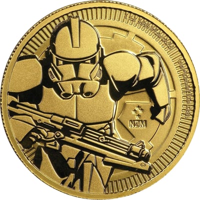 Für Star-Wars-Fans hat die New Zealand Mint eine ganz besondere Münzenserie entwickelt – seit 2016 werden Motive aus der Star-Wars-Reihe in Gold und Silber geprägt. Auf der vierten Ausgabe der „Star Wars“-Bullion-Serie ist der „Clone Trooper“ zu sehen. Auf der Bildseite ist eine Nahaufnahme eines bewaffneten Klon-Soldaten, der vor dem Hintergrund des imperialen Logos in die Schlacht läuft, abgebildet. Bei den „Clone Troopers“ handelt es sich um Soldaten aus der Großen Armee der Republik, welche in den Klonkriegen unter der Führung von Jedi-Rittern zum Einsatz kamen.