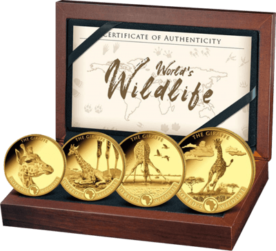 Die Giraffe zählt zu den beliebtesten und bekanntesten Vertretern der afrikanischen Tierwelt – und die Faszination für dieses grazile Wesen wird auf einer einzigartigen Münzenserie lebendig: Zum Auftakt der “World’s Wildlife”-Serie hat der Kongo gleich vier Goldmünzen mit einem Gewicht von einer Zehntelunze, einer Viertelunze, einer halben Unze und einer vollen Unze geprägt.