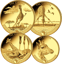 Auf den vier Prägungen ist eine afrikanische Giraffe in vier typischen Posen zu sehen – mal galoppiert sie durch die Steppe, mal labt sie sich an einem Gewässer, mal sitzt sie gemütlich im Gras und mal blickt sie aufmerksam in die Ferne.