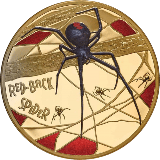 Diese colorierte 5oz Goldmünze zeigt das berühmte Münz-Design der Deadly & Dangerous Red-Back Spider.