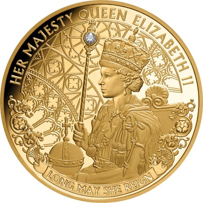 Auf der Münze sehen wir die junge Elisabet II. wie Sie die Krönungsinsignien erhält. Dazu gehören das Zepter, welches mit einem echten Diamanten versehen ist, die Krone und der Reichsapfel. Im Hintergrund sind verschiedene Ornamente zu sehen, die die Kirchenfenster der Westminster Abbey darstellen, in der die Krönung stattfand. Über dem Motiv ist der Schriftzug “Her Majesty Queen Elisabeth II” zu sehen und unter dem Motiv “Long may she reign”, was so viel bedeutet wie “möge Sie lange regieren”.