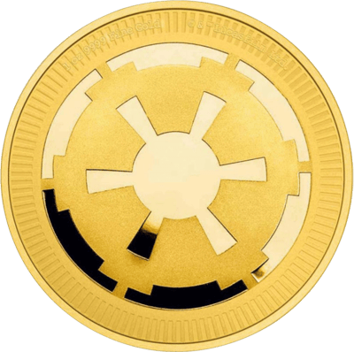 Die neue Goldanlagemünze widmet sich dem Imperiale Wappen des Galaktischen Imperiums. Nachdem der Sith-Lord und oberste Kanzler Palpatine das erste Galaktische Imperium ausrief, gestaltete er das bestehnede Wappen mit dem 8-Speichenrad um. Das neu gestaltete Wappen ziert nun ein sechsspeichiges Rad, welches das gefürchtetste und mächtigste Imperium repräsentieren sollte. Die Ähnlichkeit zum alten Wappen sollte Akzeptanz und Vertrauen schaffen aber auch einen klaren Übergang zur neuen Ordnung markieren.