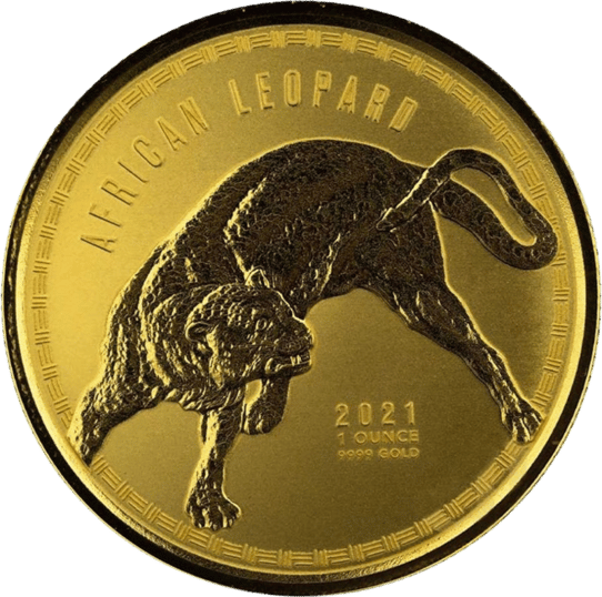 Auf der Vorderseite dieser limitierten Goldmünze sehen Sie einen afrikanischen  Leoparden, der sich umdreht. Sie erkennen sogar die dolchartigen Zähne dieses dominanten Tieres. Auf der Motivseite erkennen Sie zudem das Ausgabejahr 2021. Das Gewicht dieser Münze liegt bei einer Unze, also 31,10 Gramm, 999,99er Feingold.