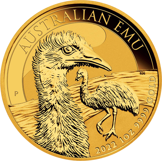 Das Motiv dieser australischen Goldmünze ist der Emu. Wachsam und aufmerksam blickt das Tier den Betrachter der Münze an. Auch der zweite Emu im Hintergrund gibt durch seine Körperhaltung zu verstehen, dass man ihm besser nicht zu nahekommen sollte. Er faucht und ein Bein ist drohend angehoben. Damit lenkt das Tier die Aufmerksamkeit auf seine gefährlichen Krallen. Die Vorderseite der Goldmünze zeigt ebenfalls den Schriftzug AUSTRALIAN EMU, das Prägejahr 2022, die Stückelung von 1 oz sowie die Angabe 999,9 GOLD. Natürlich erscheint auch hier das Sicherheitsmerkmal P – für die Perth Mint.