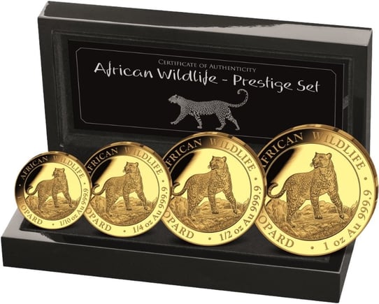 Dieses Set beinhaltet vier Goldmünzen in den Stückelungen 1/10 Unze, ¼ Unze, ½ Unze und 1 Unze. Die Münzen gehören zur African Wildlife-Serie und sind auf den Motivseiten mit einem Leopard geprägt, der gemütlich einem Baum liegt.