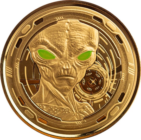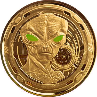 Die Vorderseite dieser Goldmünze zeigt das Gesicht eines Aliens. Die leuchtenden, giftgrünen Augen stechen sofort hervor. Es macht den Eindruck, als würde das Alien mit seinem stechenden Blick den Betrachter der Münze hypnotisieren wollen. Sein Gesicht sieht eigentlich genauso aus, wie Aliens gewöhnlich dargestellt werden. Es hat einen sehr großen Kopf und im Vergleich dazu einen äußerst schmalen und kleinen Mund. Die Augen wiederum sind ebenfalls, verglichen mit Menschenaugen, ziemlich groß. Alles in allem erinnert die Augen mehr an ein Insekt. Generell werden Aliens auch viel kleiner als Menschen dargestellt mit einem sehr dünnen, skelettartigen Körper und einer grauen Haut.