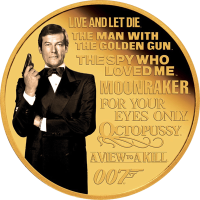 Auf der Vorderseite der Münze ist eine farbige Darstellung von Moore in einer klassischen Bond-Pose zu sehen. Das ikonische 007-Pistolenlogo sowie die Logos der sieben 007-Filme, in denen Moore zwischen 1973 und 1985 auftrat – „Leben und sterben lassen“, „Der Mann mit dem goldenen Colt“, „Der Spion, der mich liebte“, „Moonraker“, „In tödlicher Mission“, „Octopussy“ und „Im Angesicht des Todes“ – sind ebenfalls im Design enthalten. Die verführerische Rückseite der Münze zeigt das Ian Rank-Broadley-Portrait von Königin Elizabeth II., das Datum ihrer Regentschaft „1952-2022“, den Nennwert „50 DOLLAR“, das Ausgabejahr 2023 sowie das Gewicht und die Feinheit „1/4 Oz 9999 Au“.