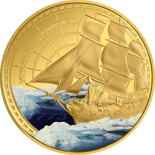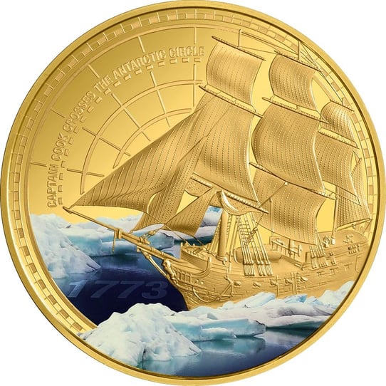 Die Münze besticht durch ihr beeindruckendes Motiv, das eine farbige Darstellung des südlichen Eismeeres sowie ein detailliertes Bild eines der Schiffe von James Cook zeigt. Die Aufschrift "CAPTAIN COOK CROSSES THE ANTARCTIC CIRCLE" und die Jahreszahl "1773" sind ebenfalls im Design enthalten. Die Rückseite präsentiert das offizielle Wappen von Niue sowie Gewicht, Feinheit, Nennwert und Ausgabejahr.
