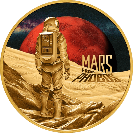 Die Vorderseite der Münze zeigt einen Astronauten in voller Montur, stehend auf dem unwirtlichen Boden des Marsmondes Phobos. Während er den majestätischen Anblick des roten Planeten Mars in der Ferne genießt, wird er selbst zum Zeugen des unermesslichen Universums, das sich in der Dunkelheit des Weltraums erstreckt. Die Gravur "MARS FROM PHOBOS" ist künstlerisch in die Szene eingebettet und verleiht der Münze eine narrative Tiefe und Bedeutung.