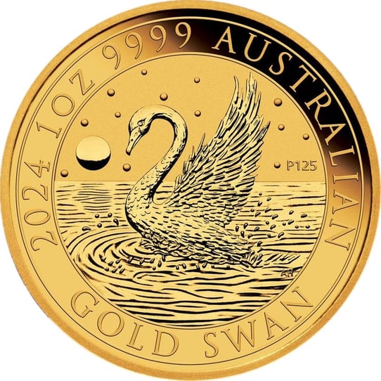 Das diesjährige Motiv zeigt einen majestätischen Schwan, der seine Flügel schlägt und sich auf dem Wasser niederlässt, was die Kraft und die Anmut dieses edlen Tieres hervorhebt. Der Nachthimmel mit Vollmond und Sternen verleiht der Szene eine mystische Aura. Die Umschrift "THE 1 OZ 9999 AUSTRALIAN GOLD SWAN" und das charakteristische "P" der Perth Mint, welches das 125-jährige Jubiläum der Münzprägeanstalt ehrt, runden das Design gekonnt ab.