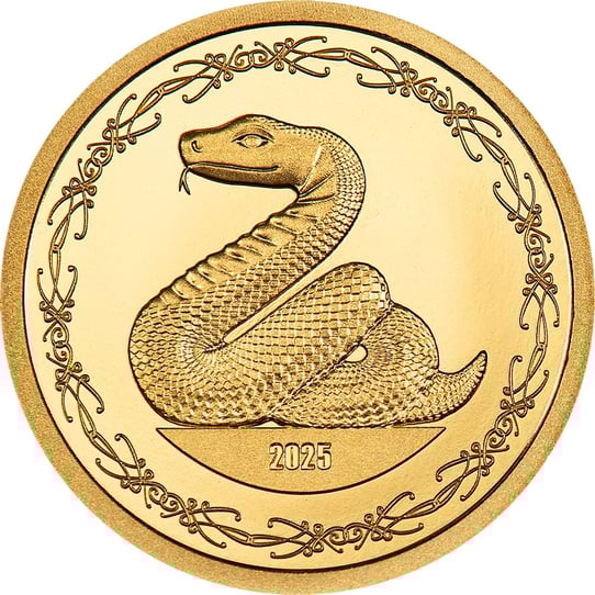 Die Rückseite der Münze schmückt eine kunstvoll gestaltete Schlange, die das chinesische Mondjahr der Schlange feiert. Das detaillierte Motiv wird durch die Inschrift „2025“ ergänzt, das Ausgabejahr dieser besonderen Münze. Auf der Vorderseite befindet sich das Wappen der Mongolei, umgeben von den Inschriften „MONGOLIA“ (das Ausgabeland), „1000 TOGROG“ (der Nennwert) und „0,5 OZ .999 GOLD“ (das Gewicht und der Feingehalt des Goldes).