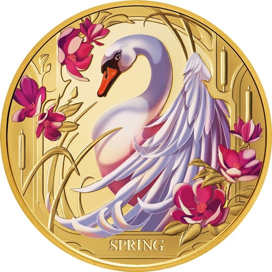 Die Münze besticht durch ihr kunstvolles und farbenfrohes Motiv: Ein eleganter Schwan, umgeben von strahlenden, pinkfarbenen Magnolien und drei Cattail-Pflanzen, ziert die Vorderseite. Die Aufschrift "SPRING" rundet das wundervolle Frühlingsmotiv ab und symbolisiert Neuanfang und Schönheit. Die Rückseite zeigt das Porträt von König Charles III sowie die Aufschriften "100 DOLLARS", "1OZ 9999 GOLD" und "NIUE 2024".