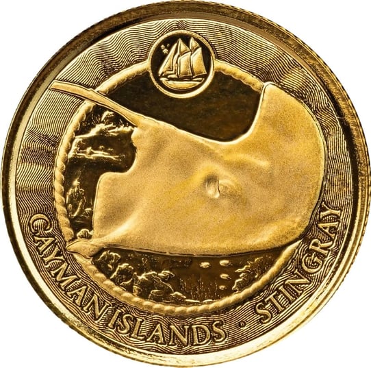Die Vorderseite der Münze zeigt einen majestätischen Stachelrochen in seiner natürlichen Umgebung, kunstvoll ergänzt durch ein kleines Segelschiff am oberen Rand. Die Rückseite präsentiert das detailreich gestaltete Staatswappen der Cayman Islands, umrahmt von wellenförmigen Strukturen, die die maritime Verbundenheit der Inselgruppe symbolisieren.