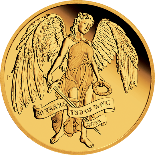 Das Herzstück dieser Münze bildet die detailreiche Darstellung der Nike, der griechischen Siegesgöttin, in Polierter Platte. Mit ausgebreiteten Flügeln, einem Schwert in der rechten und einem Palmkranz in der linken Hand, symbolisiert sie eindrucksvoll den hart erkämpften Frieden. Die Banderole mit der Aufschrift "80 YEARS END OF WW II 2025" und das Prägezeichen "P" der Perth Mint vervollständigen das kunstvolle Design.