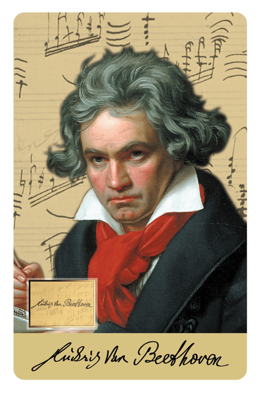 Vor dem Hintergrund handgeschriebener Notenblätter zeigt sich Ludwig van Beethoven in seiner charakteristischen roten Jacke. Die feine Detailarbeit lässt jede Nuance seines markanten Gesichts erkennen. Besonders beeindruckend: Im Hintergrund sind tatsächliche Notenzeilen seiner berühmten Kompositionen zu erkennen – ein künstlerisches Detail, das diese Rarität zu einem wahren Sammlerstück macht.