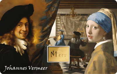 - Motiv: Eine kunstvolle Collage, die Johannes Vermeer selbst, sein berühmtes Gemälde "Das Mädchen mit dem Perlenohrring" sowie eine Atelierszene vereint – ergänzt durch den charakteristischen Schriftzug "Meer" in historischer Typografie