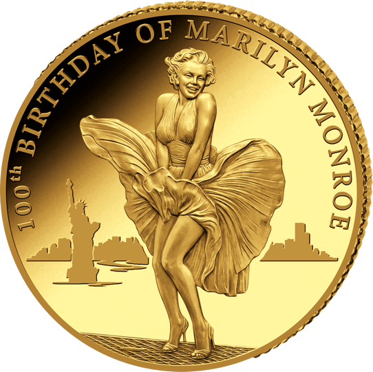 Die Bildseite dieser kostbaren Goldmünzen-Ausgabe zeigt die wohl berühmteste Filmszene aller Zeiten: Marilyn Monroe in ihrem ikonischen weißen Kleid, das durch den Luftzug eines U-Bahn-Schachts emporgeweht wird. Im Hintergrund erhebt sich majestätisch die Silhouette New Yorks mit der Freiheitsstatue. Die Umschrift „100th BIRTHDAY OF MARILYN MONROE" rahmt dieses Kunstwerk perfekt ein. Jedes Detail – von den wallenden Stofffalten bis hin zu Marilyns charakteristischem Lächeln – wurde mit höchster Präzision in das edle Metall graviert.