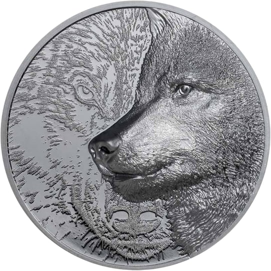 Die Rückseite zeigt zwei Wölfe, je ein Tier mit einer Ansicht von vorne und einen Wolf im Seitenprofil. Die Wölfe werden hier in einem ruhigen Zustand gezeigt. Die Seitenprofilansicht ist in einem ultrahohen Relief mit einer unglaublichen Detailgenauigkeit der Fell- und Gesichtszüge versehen. Das smartminting® Relief reicht sogar bis zum Rand der Münze! Die vordere Ansicht des Wolfes wird so detailtief getroffen, dass es so aussieht, als wäre der zweite Wolf wie Geisterbild im Hintergrund. Rasiermesserscharfe Optik und hohes Relief verbinden sich zu diesem besonderen Effekt.