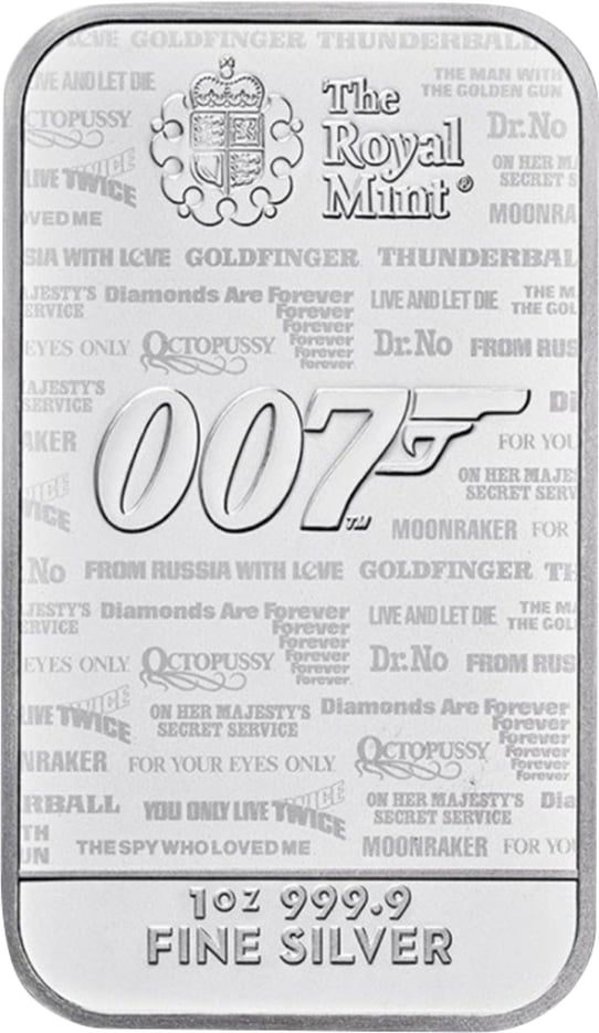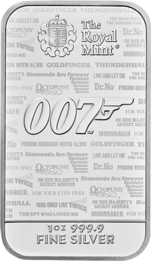Wer ist nicht schon einmal in die Rolle des James Bond geschlüpft und hat sich dabei einer seiner berühmtesten Filmsätze bedient? Der Charakter von 007 ist und bleibt zeitlos und wird viele Generationen in seinem Bann halten und ziehen. Auf der Vorderseite findet sich das 007-Symbol, an dem sich rechts der Lauf der Handwaffe von Bond zeigt. Oberhalb ist das Logo der Royal Mint zu finden, unterhalb die Schriftzüge „1oz 999,9“ und „FINE SILVER“. Auf der Rückseite sind der Filmtitel „NO TIME TO DIE“ plus kleinem 007-Symbol zu sehen. Beide Barrenseiten weisen als Hintergrund alle Titel der James-Bond-Filmreihe auf.