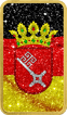 Das Motiv dieses Silberbarrens ist eine wahre Augenweide. Auf der Vorderseite prangt die Deutschlandfahne, kunstvoll veredelt mit verschiedenen Diamantpulvern in den Farben Schwarz, Rot und Gold. In der Mitte der Fahne ist das stolze Wappen von Bremen abgebildet, das die lange und reiche Geschichte dieses Bundeslandes symbolisiert. Die Rückseite des Barrens zeigt eine Deutschlandkarte, auf der Bremen in Rot hervorgehoben ist, ebenfalls veredelt mit Diamantpulvern in den Farben der deutschen Nationalflagge. Diese detailreiche Gestaltung macht den Barren zu einem echten Hingucker und einem wertvollen Sammlerstück.