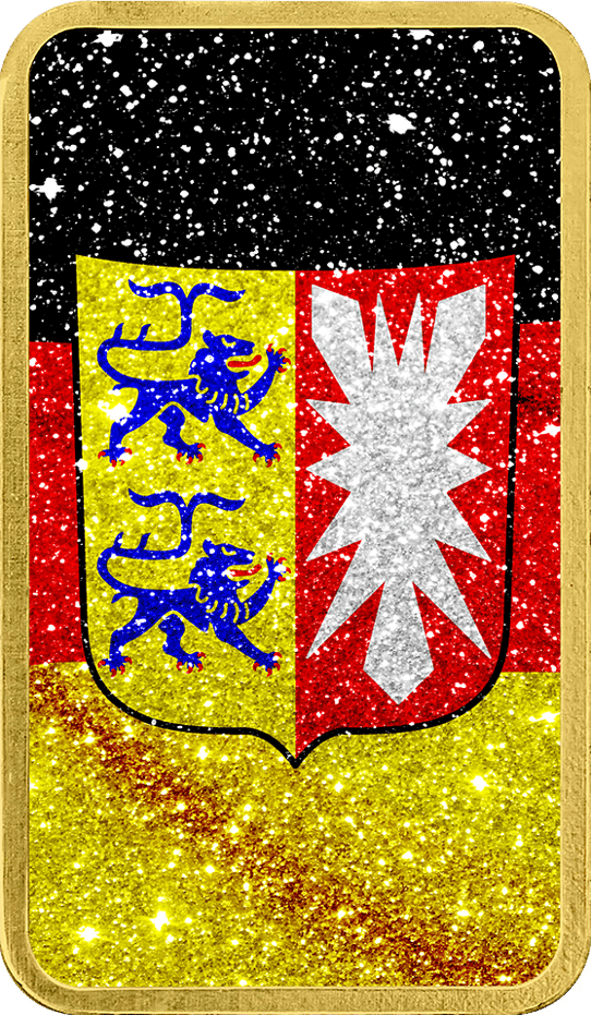Der 1 Unze Silberbarren Schleswig-Holstein ist nicht nur ein wertvolles Anlageprodukt, sondern auch ein Kunstwerk. Die Vorderseite zeigt die Deutschlandfahne, die mit verschiedenem Diamantpulver in Schwarz, Rot und Gold veredelt wurde. Im Mittelpunkt steht das prächtig gestaltete Wappen von Schleswig-Holstein, das durch seine farbenprächtige Darstellung beeindruckt. Auf der Rückseite ist eine Deutschlandkarte abgebildet, bei der das Bundesland Schleswig-Holstein rot hervorgehoben wurde. Auch hier wurde Diamantpulver in den Farben Schwarz, Rot und Gold verwendet, um die Karte zu veredeln.