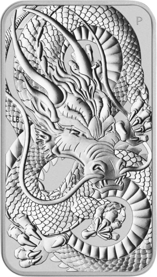 Auf der Vorderseite des Münzbarrens ist ein kunstvoll gestalteter, schlangenförmiger Drache abgebildet, der ein Symbol für Reichtum und Prestige in vielen Kulturen ist. Das "P" in der rechten oberen Ecke steht für die Prägestätte "The Perth Mint".