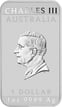 Auf der Rückseite des Münzbarrens ist ein Bildnis von König Charles III. abgebildet, das den offiziellen Charakter dieses Anlageprodukts unterstreicht. Die Inschriften „Australia“, „1oz 9999 Ag“ und der Nennwert „1 Dollar“ runden das Design ab und machen den Barren zu einem anerkannten Zahlungsmittel in Australien.