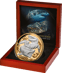 Das Motiv der Münze ist ein dramatisches Zusammentreffen zweier Spitzenprädatoren der Meere. Eingebettet in einen glänzenden, goldenen Hintergrund zeigt das silberne Relief einen Weißen Hai und ein Salzwasserkrokodil in einer dynamischen Pose, umgeben von einem detailreichen Korallenriff. Beide Raubtiere, bekannt für ihre messerscharfen Zähne und ihre dominante Stellung im Ökosystem, sind in voller Pracht und mit einem Hauch von Bedrohung dargestellt. Diese Szene wird durch die Kontraste des teilvergoldeten Designs und der hochglanzpolierten Oberfläche eindrucksvoll hervorgehoben.