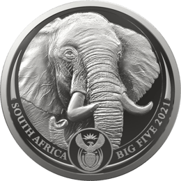 Die erste Ausgabe der Big Five Serie II widmet sich erneut dem majestätischen Elefanten und präsentiert erstmals eine 5 Unzen Silbermünze. Das detaillierte Design zeigt einen ausgewachsenen Elefantenkopf mit den Aufschriften „SOUTH AFRICA“, „BIG FIVE 2021“ und dem südafrikanischen Wappen. Die Rückseite besteht aus zwei Hälften eines Elefantenkopfes, die zusammengesetzt ein vollständiges Nahaufnahmeporträt eines Elefanten ergeben. Mehrere Münzen nebeneinander ergeben eine ganze Elefantenherde. Der Afrikanische Elefant steht als Symbol für Kraft und Stärke und ist bekannt für sein ausgezeichnetes Gedächtnis und sein ausgeprägtes Sozialverhalten. Die Lieferung der auf nur 500 Exemplare limitierten 5 Unzen Silbermünze erfolgt im Original-Holzetui.