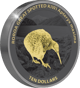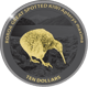 Einzigartige Veredelung: Die teilvergoldete Darstellung des Kiwis auf Black Proof Silber unterstreicht die Exklusivität