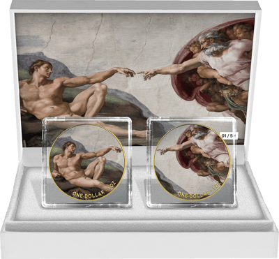 Die beiden Münzen dieses exquisiten Sets zeigen auf der einen Seite Adam, auf der anderen den Schöpfer, wie sie auf dem berühmten Fresko Michelangelos in der Sixtinischen Kapelle dargestellt sind. Die detailreiche Colorierung bringt das ikonische Motiv der Erschaffung Adams zum Leben, während die Vergoldung einzelne Elemente akzentuiert und für eine hochwertige Optik sorgt. Auf den Rückseiten ist die Decke der Sixtinischen Kapelle künstlerisch wiedergegeben, ein weiteres Zeugnis des kreativen Geistes Michelangelos.