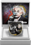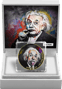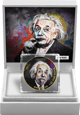 Die Vorderseite zeigt das ikonische Bild von Albert Einstein mit herausgestreckter Zunge, welches auf einem kreativen Hintergrund mit bunten Graffiti-Elementen eingebettet ist. Die Farben Rot, Gelb, Blau und Grau kontrastieren gekonnt mit dem Gold des Randes, auf dem "ONE DOLLAR 1OZ FINE SILVER" und weitere Details zu lesen sind. Die Rückseite ziert Einstein an einer Tafel, auf der seine berühmte Formel E=m*c2 verewigt ist. Diese Münze ist nicht nur eine Würdigung des genialen Physikers, sondern auch ein Kunstwerk, das in keiner Sammlermünzen-Kollektion fehlen sollte.