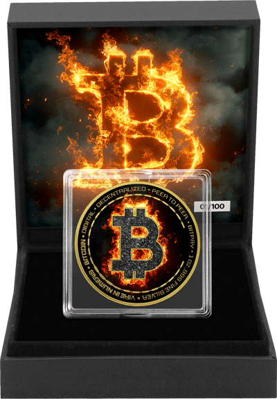Die Vorderseite der Münze zeigt das weltweit bekannte Bitcoin-Symbol, das von Flammen umgeben ist und somit die Hitze und Dynamik der Kryptowährungsmärkte symbolisiert. Die "Iced Out"-Optik verleiht dem Motiv eine zusätzliche Tiefe, die die Faszination für das digitale Gold unterstreicht. Diese besondere Münze ist nicht nur für Anhänger der Kryptowährungen eine attraktive Anlageoption, sondern auch für Anleger, die nach einer Verbindung zwischen traditionellen und modernen Anlageformen suchen.