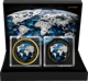 Die beiden 1-Unzen-Silbermünzen dieses Sets sind wahre Kunstwerke. Auf der Vorderseite erstrahlt das Porträt von König Charles III, das durch die Veredelung mit Gelbgold, Ruthenium und Diamantstaub eine unvergleichliche Eleganz erhält. Die Rückseite zeigt eine detailreiche Darstellung der Erde, die mit ihrem tiefen Blau und den glänzenden Kontinenten aus Diamantstaub den Betrachter in ihren Bann zieht. Diese Kombination aus edlen Materialien und präziser Handwerkskunst macht das Set zu einer seltenen Sammlermünze, die in keiner Kollektion fehlen sollte.