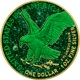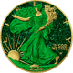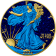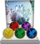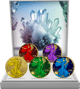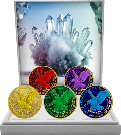 Das Set besteht aus fünf hochwertig veredelten American Eagle Münzen in den Farben Gelb, Rot, Grün, Blau und Violett. Jede Münze wurde mit größter Präzision teilweise vergoldet und mit farblich abgestimmtem Diamantstaub versehen. Als besonderes Highlight ziert jede Münze ein passender Edelstein.