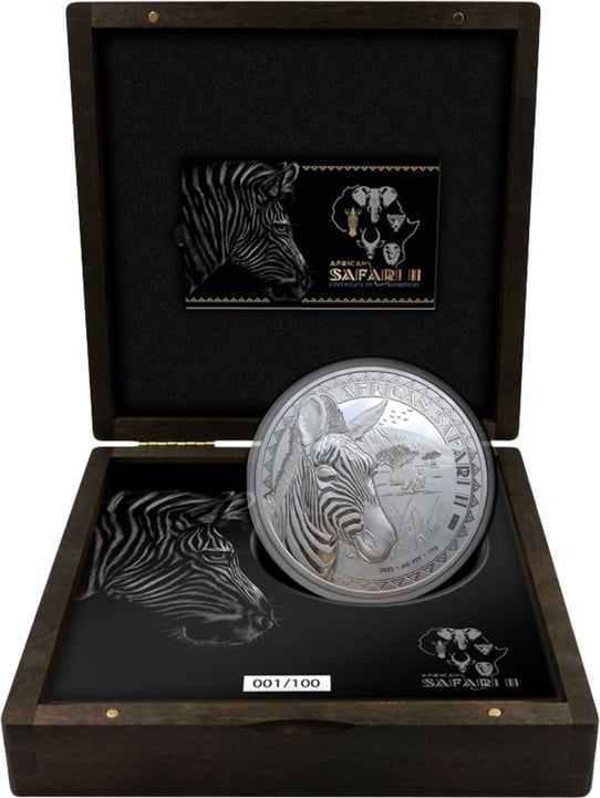 Mit African Safari II geht die erfolgreiche African Safari-Reihe in die nächste Runde. Auch diese Serie setzt sich aus fünf tierischen Motiven zusammen. Das Zebra ist das zweite Motiv. Die Zebra Münze ist auf nur 100 Stück limitiert und in jedem Exemplar ist eine individuelle Seriennummer eingraviert.