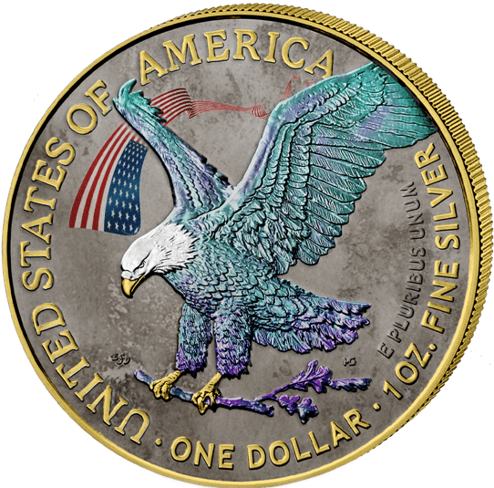 Das herausragende Merkmal dieser Münze sind die Hologramm-Motive, die das klassische Motiv des American Eagle 2023 auf einzigartige Weise zum Leben erwecken. Der Antik Finish Hintergrund verleiht der Münze eine nostalgische Note und lässt sie wie ein historisches Kunstwerk wirken. Im Hintergrund ist die US-Flagge in Farbe zu sehen, was die Verbundenheit mit den Vereinigten Staaten symbolisiert. Der Rand und die Schrift der Münze sind mit Vergoldung versehen, was einen Hauch von Luxus hinzufügt.