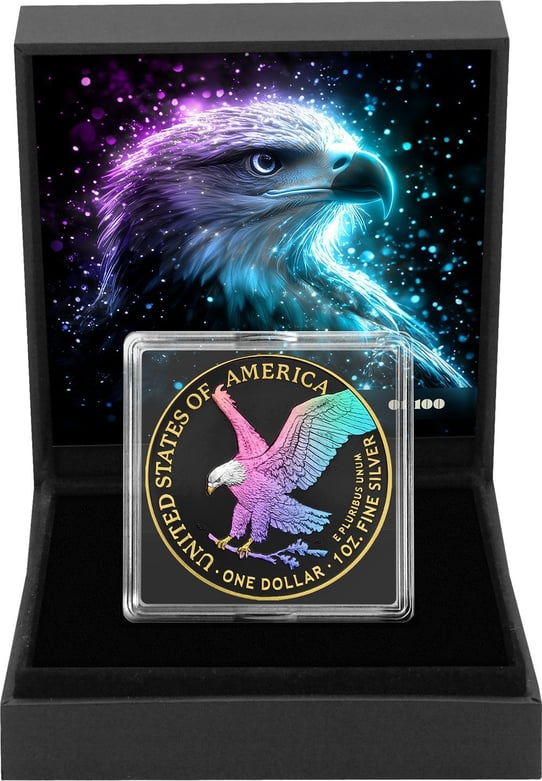 Auf der Vorderseite der Münze ist ein majestätischer Adler zu sehen, dessen Flügel in lebhaften Lila- und Blautönen erstrahlen. Der detailreiche Hintergrund in Schwarz und Gold betont die beeindruckende Darstellung des Adlers. Umgeben vom Schriftzug "UNITED STATES OF AMERICA", "ONE DOLLAR", "1 OZ. FINE SILVER" und "E PLURIBUS UNUM", verkörpert diese Münze die Werte und den Stolz der Vereinigten Staaten.