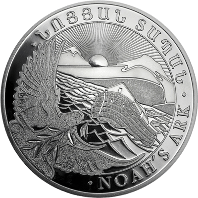 Die Silbermünze Arche Noah ist seit 2011 als Anlagemünze präsent. Auf der einen Seite der Münze finden Sie das Staatswappen Armeniens, den Nennwert von 10.000 Dram sowie das Prägejahr 2016. Auf der anderen Seite ist die berühmte Arche Noah abgebildet, zusammen mit einer Taube, die einen Ölzweig im Schnabel hält – ein Symbol für das Ende der Sintflut.