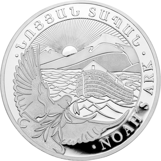 - Motiv: Die Münze zeigt die berühmte Arche Noah, wie sie auf der Suche nach Land eine Taube mit einem Ölzweig im Schnabel aussendet. Dieses Motiv symbolisiert Hoffnung und einen Neuanfang - Eigenschaften, die auch das Edelmetall Silber verkörpert.