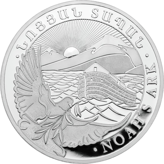 Auf der Gegenseite der Münze ist das ikonische Motiv der Arche Noah zu sehen, wie sie auf den Wellen des Meeres schaukelt, mit dem Berg Ararat und einer aufgehenden Sonne im Hintergrund. Eine Taube mit einem Olivenzweig im Schnabel – ein universelles Symbol des Friedens und der Hoffnung – vervollständigt das Bild. Der englische Name "Noah's Ark" umrahmt das Bildnis und verbindet die Münze mit ihrer Geschichte und ihrem Ursprung.