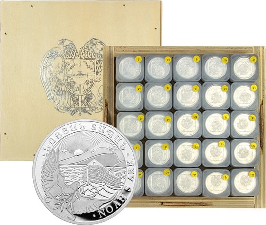 Die elegante Holzschatulle mit dem armenischen Wappen ist nicht nur eine Augenweide. Sie ist Ihre persönliche Schatzkammer! Mit 7.775 Gramm reinem Silber halten Sie einen substantiellen Wert in Händen. Die systematische Nummerierung von 1 bis 25 in den sichtbaren Kunststoffkapseln zeigt: Hier wurde an alles gedacht. Kompakte Lagerung trifft auf maximale Flexibilität.