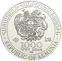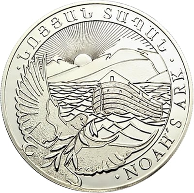 Auf der Gegenseite der Münze ist die Arche Noah abgebildet, die auf dem Berg Ararat ruht. Eine Taube mit einem Olivenzweig im Schnabel, ein Symbol für das Ende der Sintflut und den Beginn eines neuen Zeitalters, fliegt über die Szene. Die Umschrift "Noah`s Ark" ist wiederum in zwei Sprachen aufgeprägt. Der Rand der Münze ist geriffelt, um zu verhindern, dass unbemerkt Teile des Silbers von der Münze abgekratzt werden.