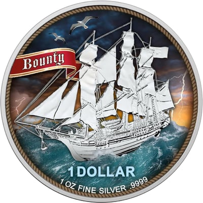 Die Münze besticht durch ihre detailreiche Gestaltung und hohe Qualität. Das Motiv zeigt das berühmte Segelschiff "Bounty" auf hoher See, umgeben von einem stürmischen Himmel, der durch Blitze erleuchtet wird. Das Schiff selbst schimmert in reinem Silber und hebt sich deutlich von dem colorierten Hintergrund ab. Auf der linken Seite der Münze ist eine farbige Banderole abgebildet, die den Namen "Bounty" trägt. Unterhalb des Schiffs sind der Nennwert von 1 Dollar sowie die Feinheit und das Gewicht der Münze vermerkt.