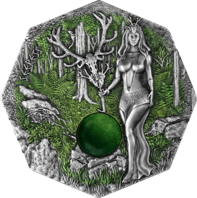 Das Motiv der Münze ist in der numismatischen Welt einzigartig. Es zeigt eine germanische Seherin, die in ihrer zeremoniellen Kleidung und mit einem Stab in der Hand tiefes botanisches Wissen, Schutz vor bösen Kräften und die Fähigkeit, die Zukunft vorherzusagen, symbolisiert. Neben ihr liegt ein mystischer Kristall auf einem Steinhaufen, umgeben von Ratatosk, dem mythischen Eichhörnchen, das zwischen den Welten Nachrichten überbringt. Die Rückseite ist nicht weniger beeindruckend und zeigt das zweiköpfige Adler-Emblem der Germania Mint, umgeben von Tier- und Drachenschädeln sowie germanischen Runen.