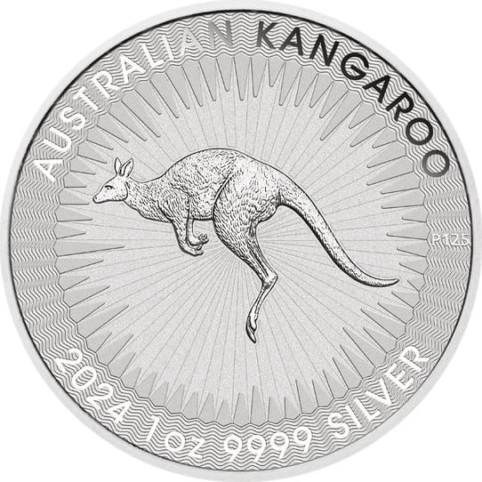 Die Vorderseite der Münze zeigt ein lebhaftes Bild eines springenden Kängurus, eingefasst von einem glänzenden Rand, der an die Sonnenstrahlen des australischen Outbacks erinnert. Das Motiv ist umgeben von den Worten "AUSTRALIAN KANGAROO", während am unteren Rand der Münze die Inschrift "1 OZ 9999 SILVER" und das Prägejahr "2024" zu finden sind.