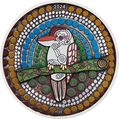 Das Motiv dieser Münze zeigt eine farbenfrohe Darstellung eines Kookaburras, inspiriert von einem Ölgemälde des Künstlers Kevin Bynder aus dem Volk der Whadjuk-Yuet-Ballardong. Die weißen Elemente des Designs symbolisieren den weißen Ocker, mit dem sich die Urvölker bemalten, wenn sie den Kookaburra-Traumtanz aufführten. Der Hintergrund besteht aus farbigen Punkten in verschiedenen Blautönen, die den Morgen-, Tages- und Abendhimmel darstellen. Grün steht für die Blätter während der Djeran-Saison (April/Mai) und Braun für die Kambarang-, Birak- und Bunuru-Jahreszeiten (Oktober/März). Dieses detailreiche und symbolträchtige Design macht die Münze zu einem wahren Meisterwerk.