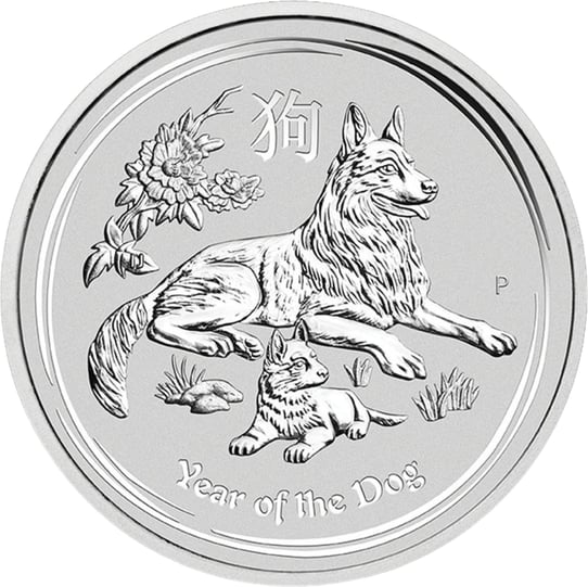 Die Münze ziert ein ausgewachsener Schäferhund mit einem Welpen, begleitet von chinesischen Schriftzeichen und dem Prägebuchstaben "P" für die Perth Mint. Auf der Rückseite zeigt die Münze ein Portrait von Queen Elisabeth II., umgeben von den Inschriften "ELISABETH II", "AUSTRALIA", dem Gewicht, der Feinheit, dem Prägejahr und dem Nennwert.