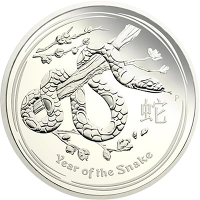 Das Avers der Münze zeigt eine eindrucksvolle Schlange, die sich um einen Ast schlängelt, umgeben von Zweigen. Chinesische Schriftzeichen und ein "P" für Perth Mint Australia sind ebenfalls abgebildet. Der untere Rand der Münze trägt die Inschrift "Year of the Snake".