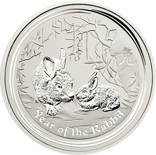 Auf der Motivseite der Münze ist ein junger Hase zusammen mit seinem Elterntier dargestellt, die im Schutz eines Strauchs Zuflucht suchen. Unterhalb dieser Szene ist der Schriftzug "Year of the Rabbit" zu sehen und rechts daneben das chinesische Schriftzeichen für "Hase". Am linken Rand der Münze befindet sich der Buchstabe "P", der für die Perth Mint steht.